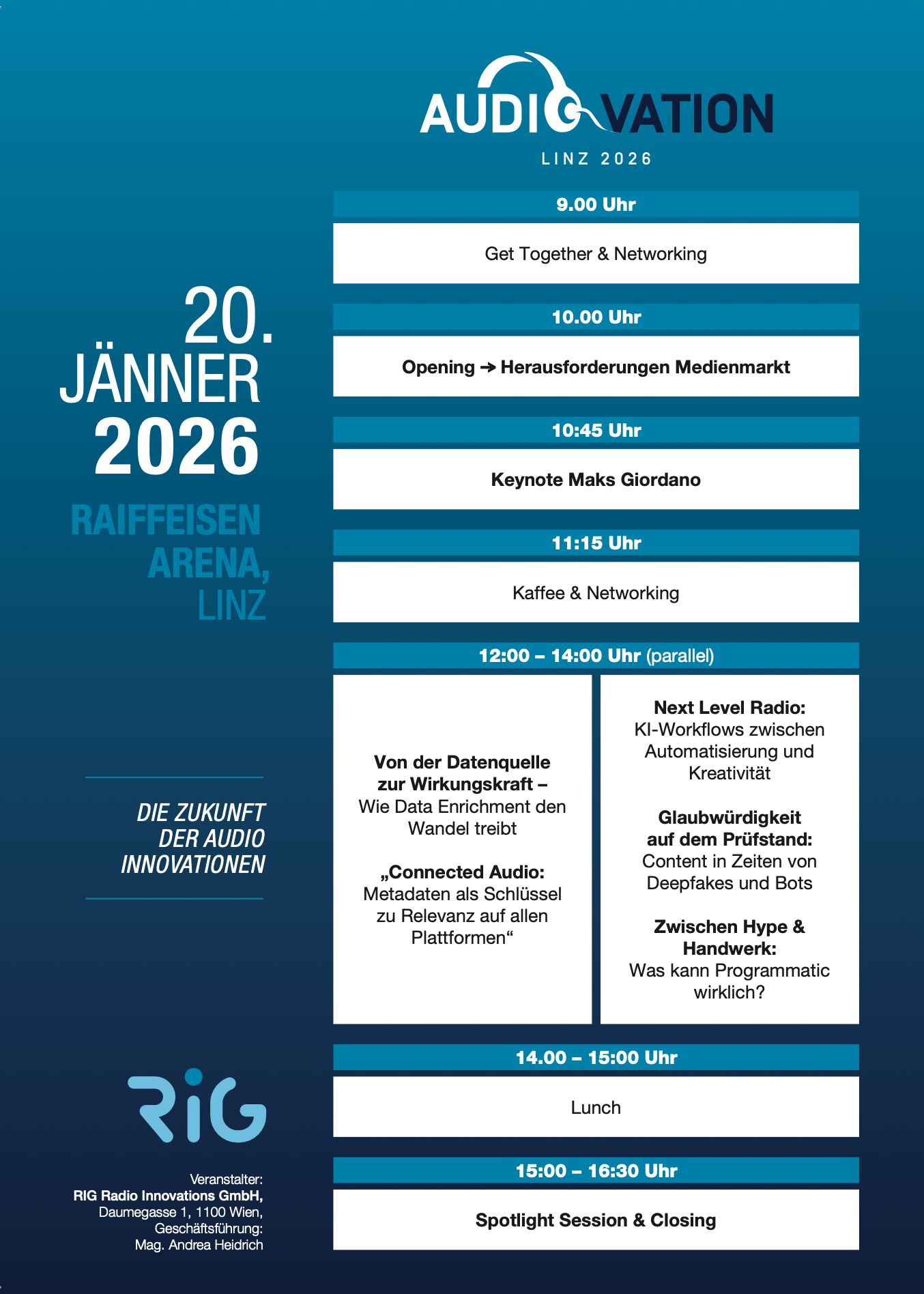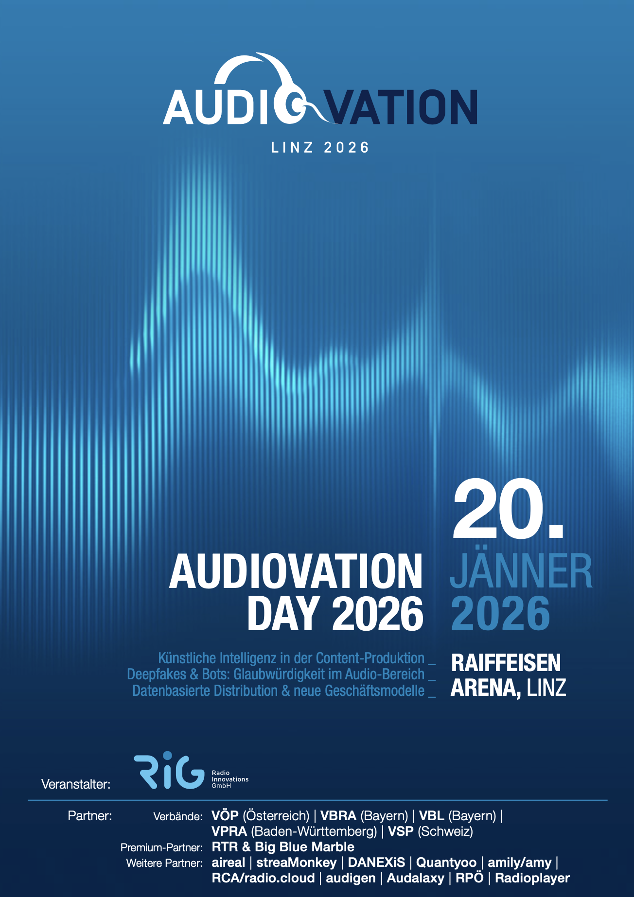 Am AudioVation Day treffen sich Radiomacher:innen, Stakeholder, Visionär:innen, Kreative und Tech-Profis, um gemeinsam die Zukunft des Hörens zu erleben und sich auszutauschen. Von KI in Workflows über Verified Content, der Wirkungskraft von Datenquellen bis hin zu Programmatic-Strategien – hier bekommen Sie alles, was morgen wichtig ist.